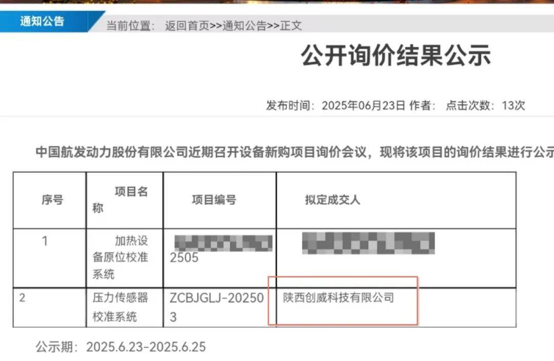 近日,陜西創(chuàng)威科技有限公司成功中標(biāo)中國(guó)航發(fā)動(dòng)力股份有限公司“壓力傳感器校準(zhǔn)系統(tǒng)”采購(gòu)項(xiàng)目。
