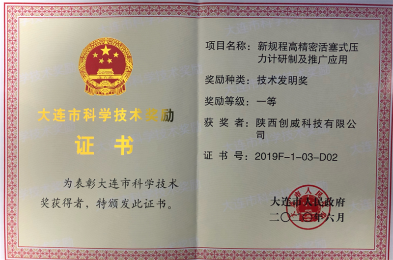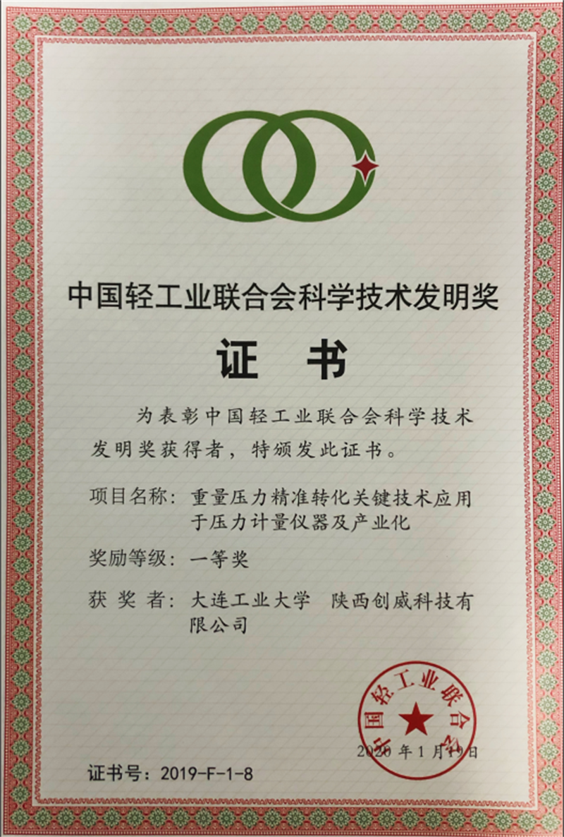 2020年1月19日,陜西創(chuàng)威科技有限公司獲中國輕工業(yè)聯(lián)合會科學(xué)技術(shù)發(fā)明獎一等獎。同年6月,創(chuàng)威又獲由大連市人民政府頒發(fā)的科學(xué)技術(shù)發(fā)明獎一等獎。獲獎項目均為我司高精密活塞式壓力計產(chǎn)品,不僅代表著國內(nèi)權(quán)威機構(gòu)對創(chuàng)威突出成績的肯定與鼓勵,還代表著我司產(chǎn)品做為行業(yè)“領(lǐng)跑者”已步入新的高度。