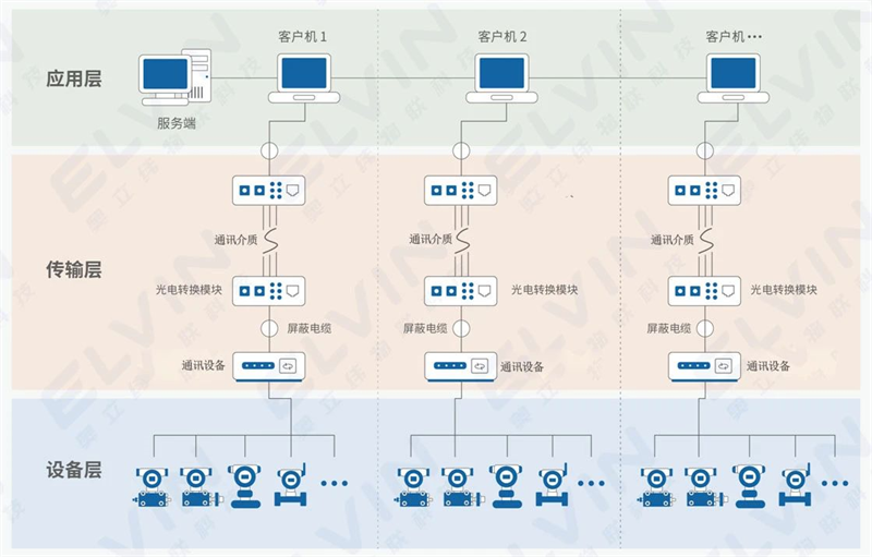 服務(wù)端<--->客戶機(jī)<--->屏蔽電纜<--->光電轉(zhuǎn)換模塊<--->通信介質(zhì)<--->光電轉(zhuǎn)換模塊<--->屏蔽電纜<--->智能數(shù)字采集終端<--->井下專用測(cè)量傳感器