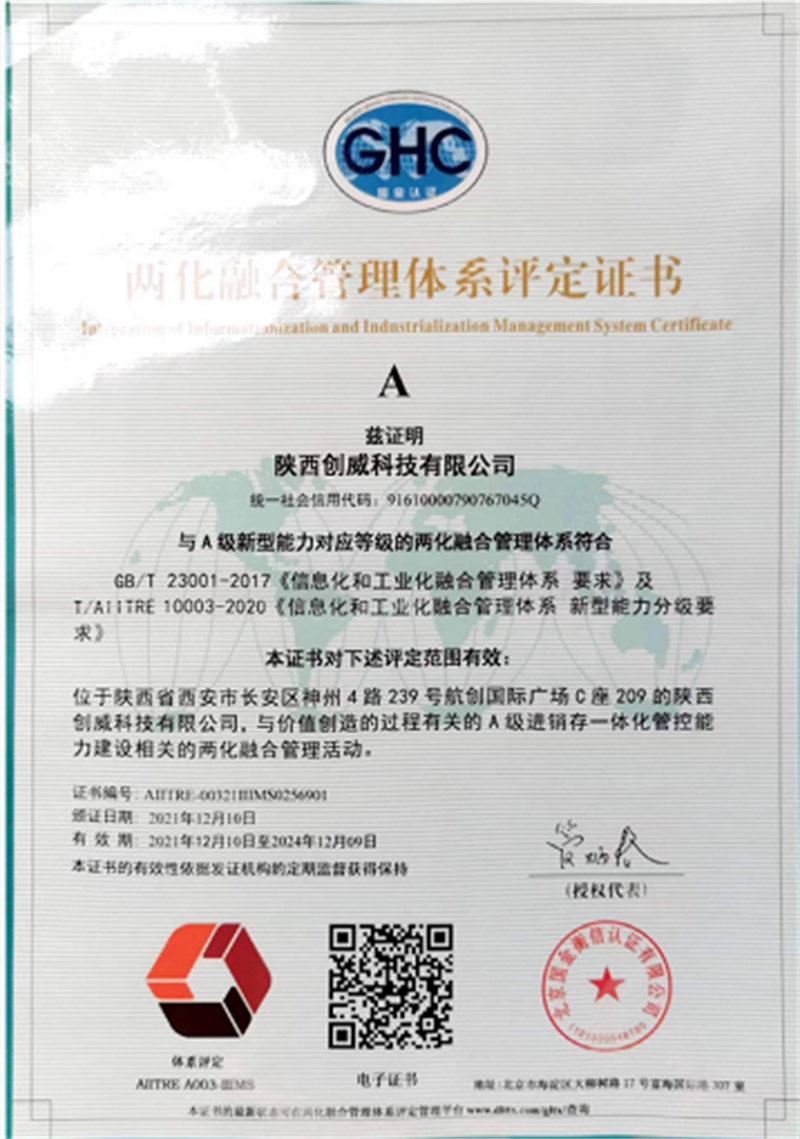 10月,創(chuàng)威科技通過了兩化融合管理體系評定的復(fù)審,獲得了“兩化融合管理體系評定證書”,此項證書的頒發(fā)證明了陜西創(chuàng)威科技有限公司符合A級新型能力對應(yīng)等級的兩化融合管理體系。與此同時,榮獲“知識產(chǎn)權(quán)管理體系認(rèn)證證書”,該項證書進(jìn)一步確立了創(chuàng)威科技在壓力計量檢測儀器的研發(fā)、生產(chǎn)、銷售相關(guān)的知識產(chǎn)權(quán)管理等方面的權(quán)利。