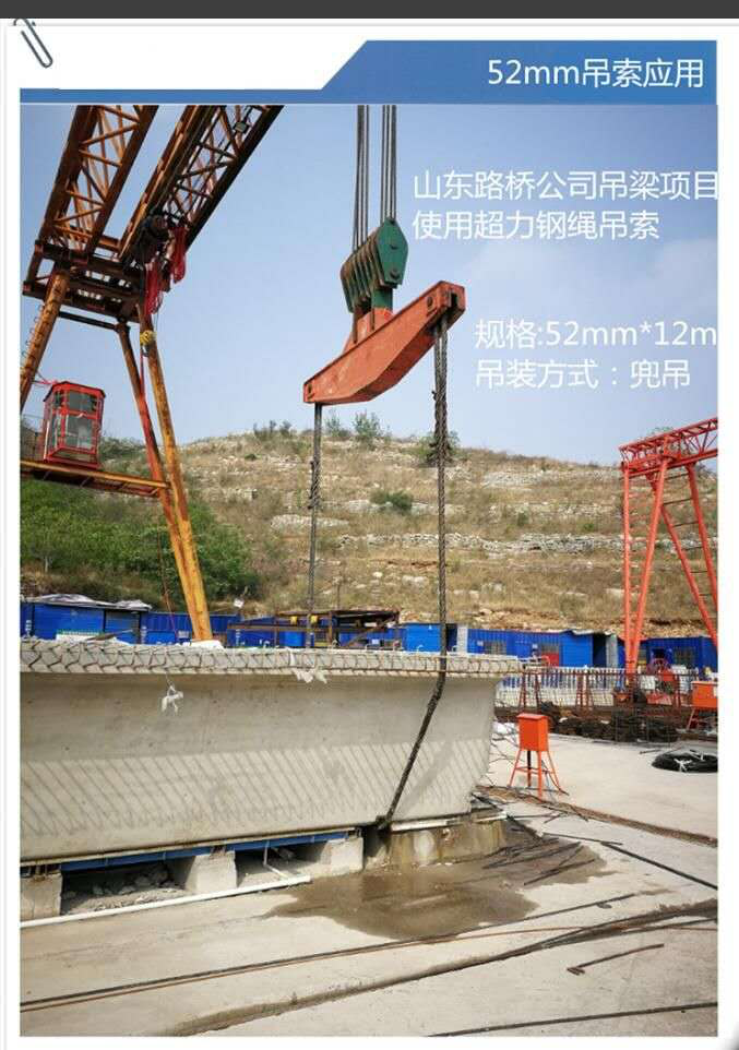 咱們南京超力鋼繩長時間給中鐵各局、浙江建工、我國十九冶、二十冶、山東路橋集團(tuán)、三河管樁、石化公司、各地煤礦等大型企業(yè)供貨,用到最多的便是手藝插編鋼絲繩和鋁合金限制鋼絲繩,咱們簡稱吊索具。還有一些大直徑的鋼絲繩,耐磨鋼絲繩,特別繩,防旋轉(zhuǎn)鋼絲繩,打樁機(jī)鋼絲繩等特別類型的,咱們備貨充足,類型齊全。咱們一起來看看山東路橋(圖一)和中交四航局(圖二),在吊橋梁方面是如何使用咱們超力鋼繩吊索具的。